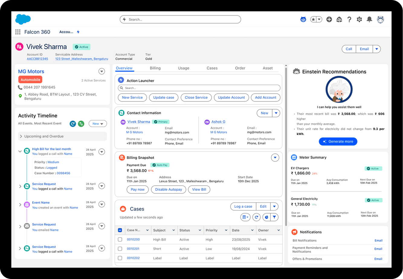 The Salesforce Account 360 View was designed to address key inefficiencies in enterprise customer support. It consolidates disparate systems—billing, usage, assets, service, and more—into one seamless interface tailored for agent efficiency.